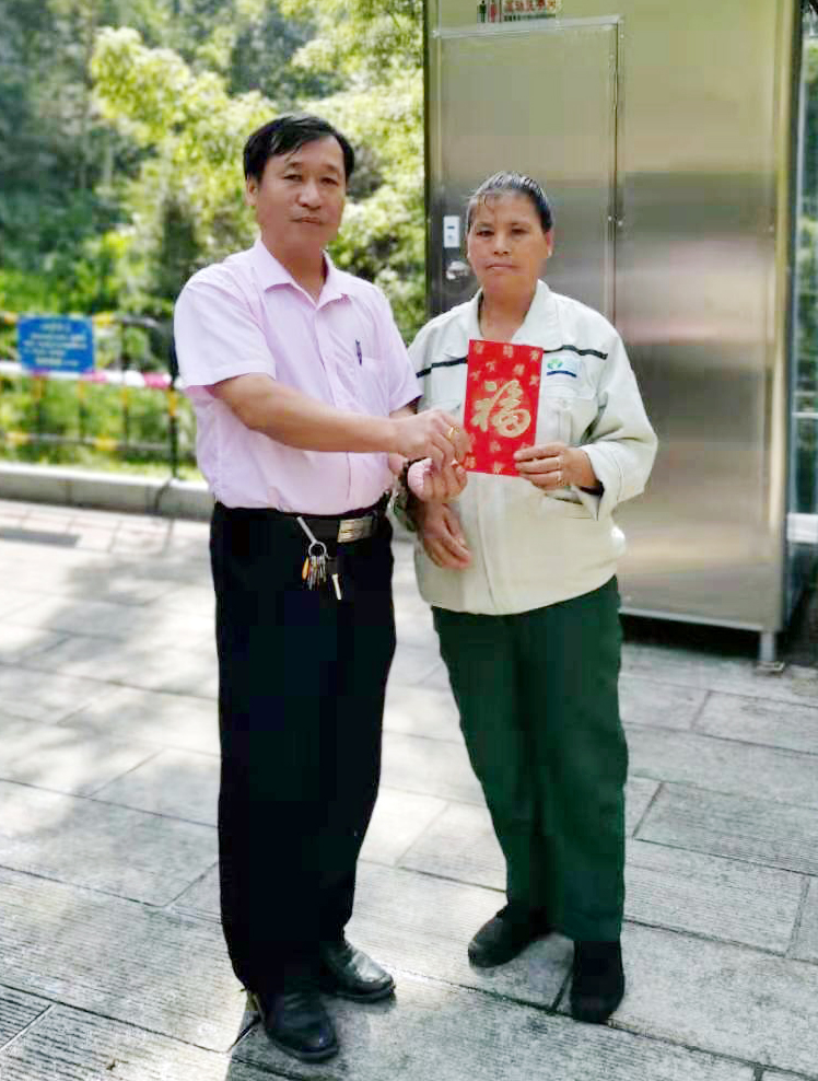 今天,福田A1项目梅林公园三圣宫公厕员工刘桂珍脸上充满着幸福的笑容,且看,原来是项目经理给她发大红包呢!有什么喜事呢?